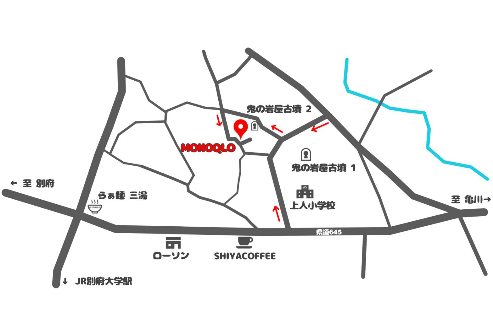 県道645号線より、上人小学校横の道からお入りください。※赤矢印を参照
